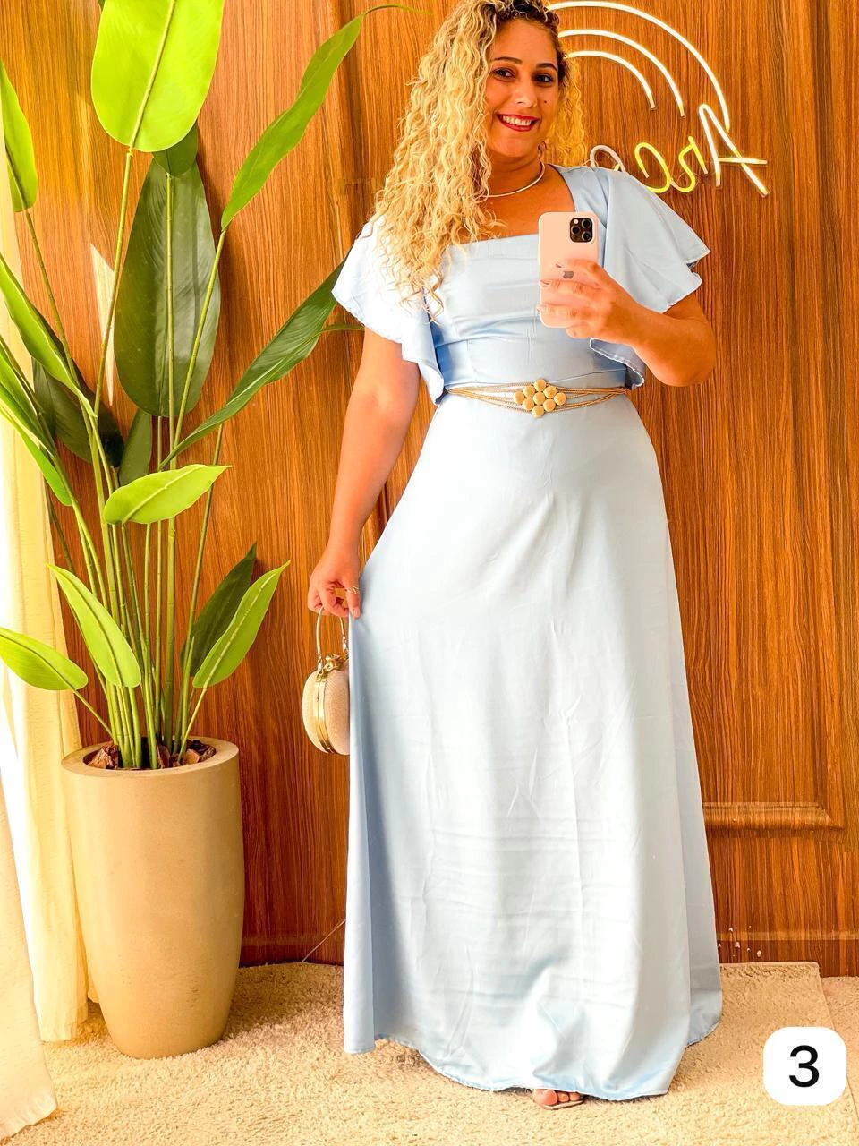 Vestido em cetinpremium, contém zíper nas costas e não acompanha cinto.