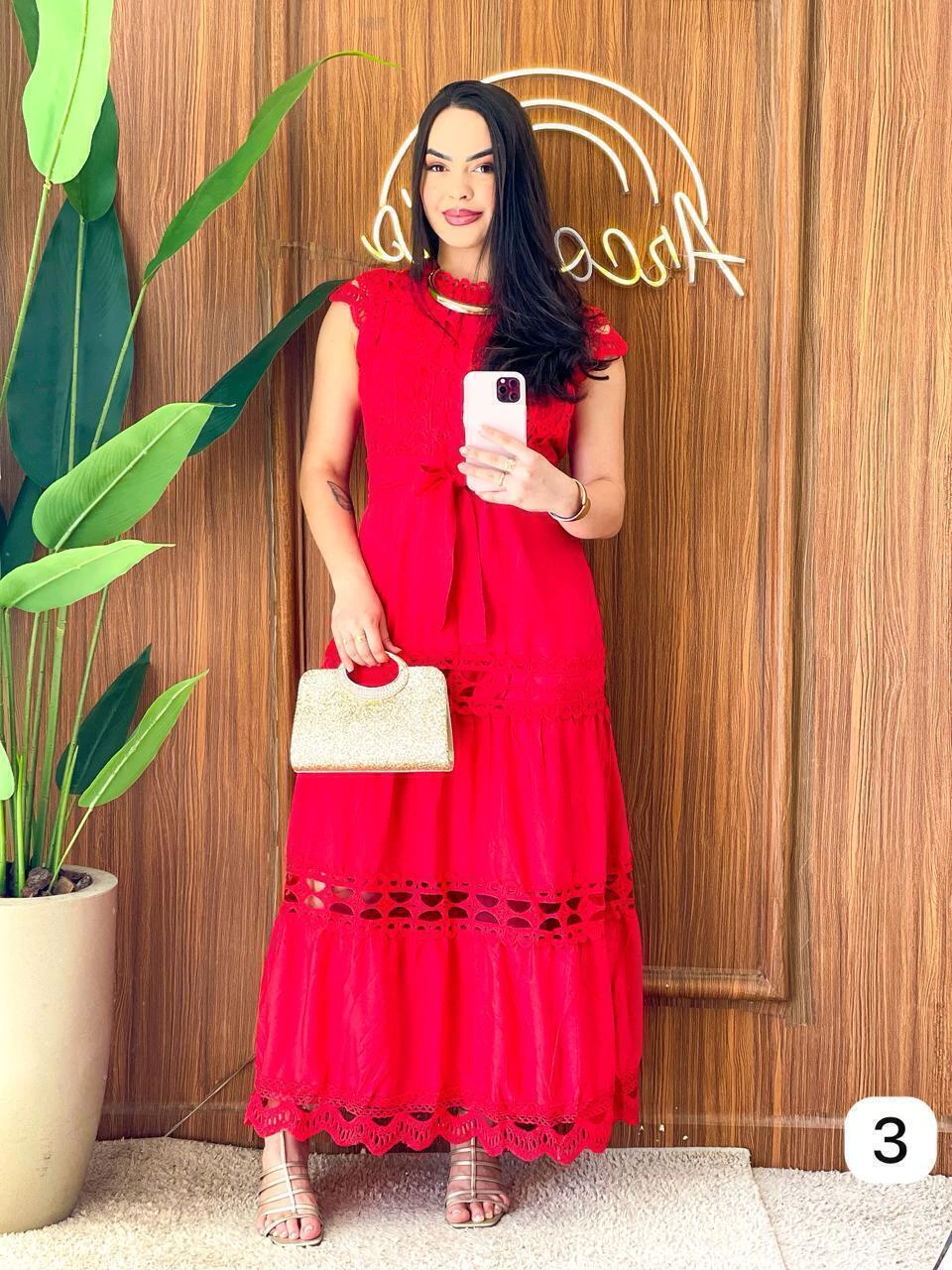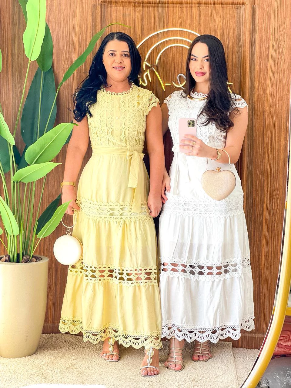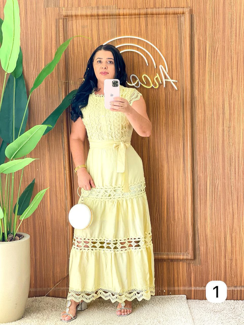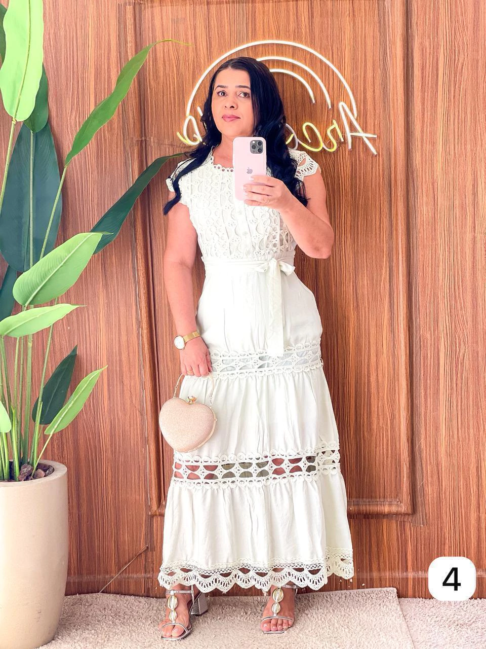 Vestido com detalhes em guipir, contém zíper atrás, tamanhos P, M e G.
