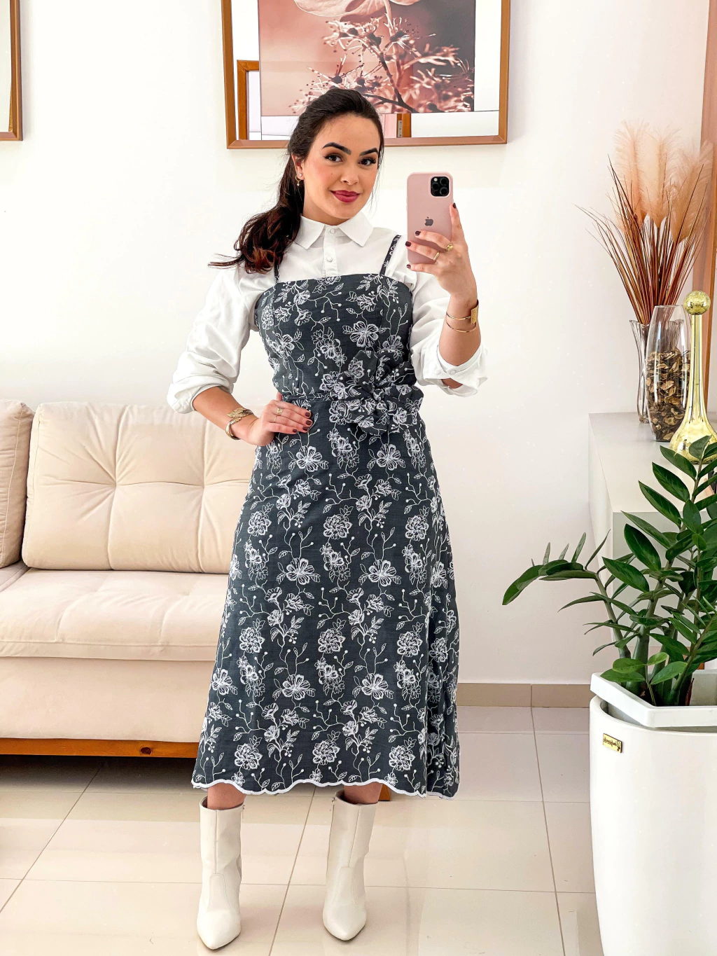 Conjunto vestido e blazer, ziper nas costas, forrado.