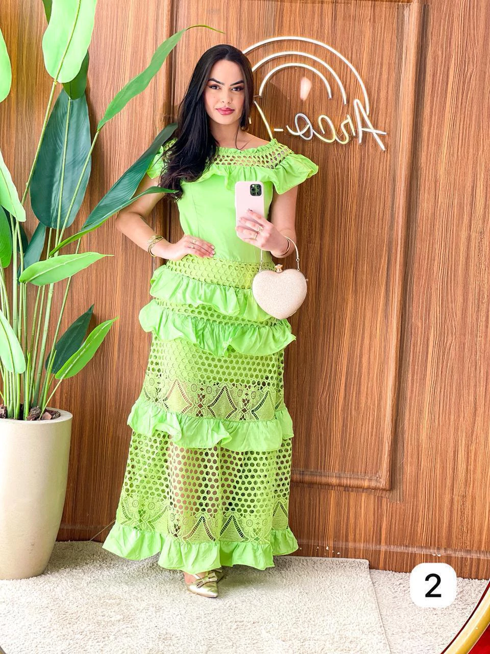 Vestido em tecido tricoline com detalhes em guipir, contém zíper nas costas.